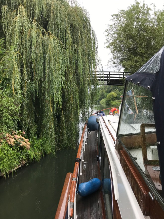 We vertrekken in de gietende regen, het kanaal is juist breed genoeg om te draaien. Tricky, 35 cm over !