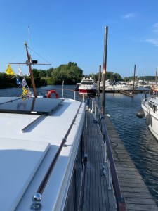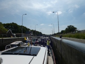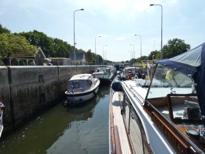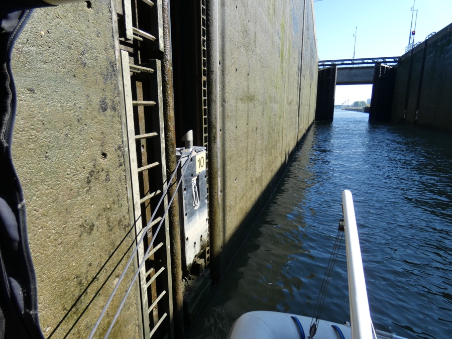 We moeten allemaal efkens naar de wachtsteiger de sluis is bezig voor de andere kant, opnieuw een catacombesluis met glijdende bolders en opgelet zegt de permanentie ‘niet alle bolders zijn aanwezig’ dus zorgen dat we er één hebben.