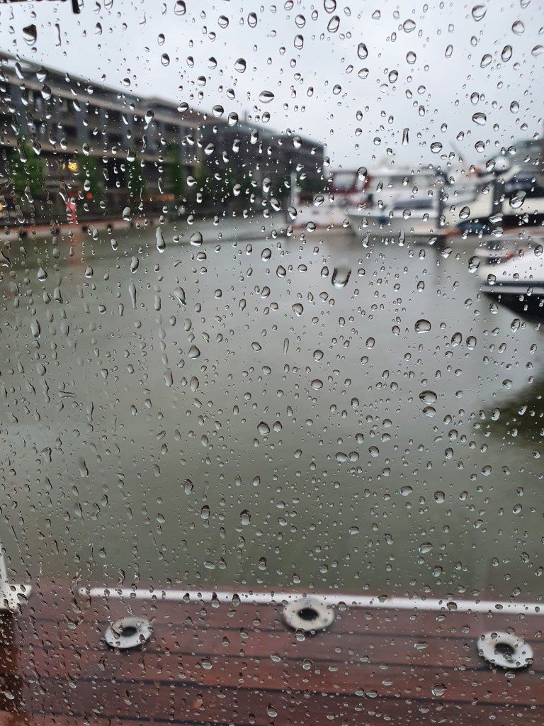 Gieten dat het doet, we zijn helemaal alleen op het water op een paar vrachters na omdat het hun broodwinning is maar de rest denkt er het hunne van. Welk een kieken vaart er nu ook met zo’n weer, wel dat zijn wij. Het kanaal af en dan naar het Albertkanaal groen en recht en breed waarom geen idee? Op naar Hasselt 4 uur varen van juist niet in slaap vallen er valt werkelijk niks te beleven.