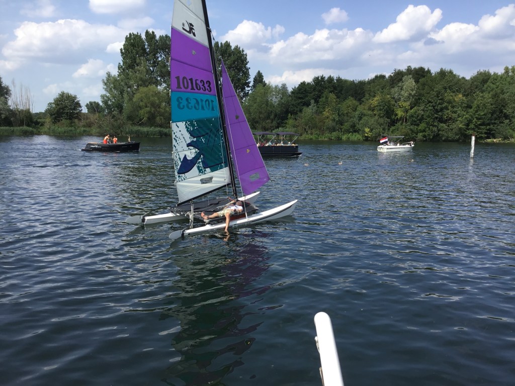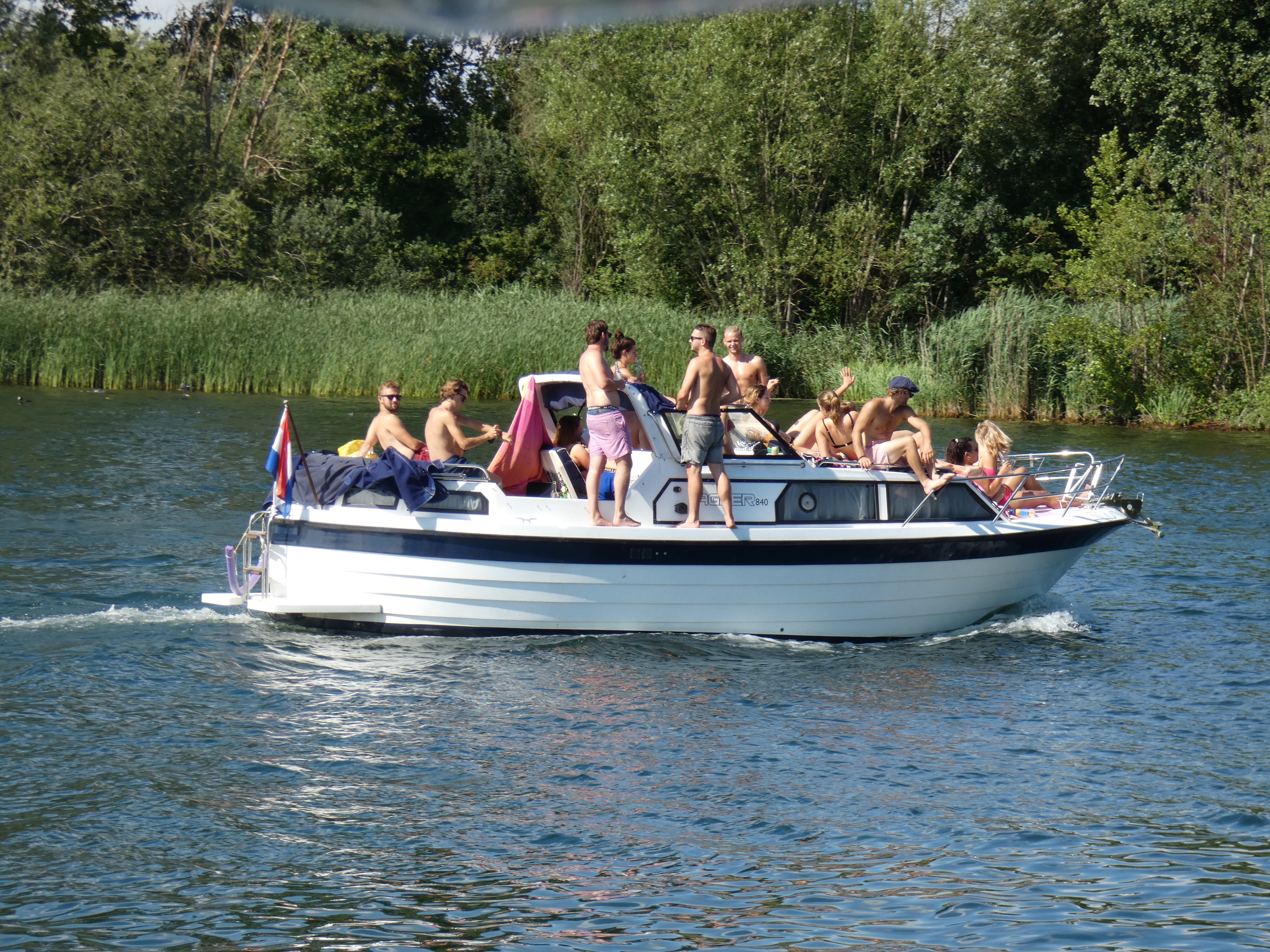 We varen naar de plas en ankeren, plank en bootje worden op sleep genomen, de jeugd duikt, springt en vaart.