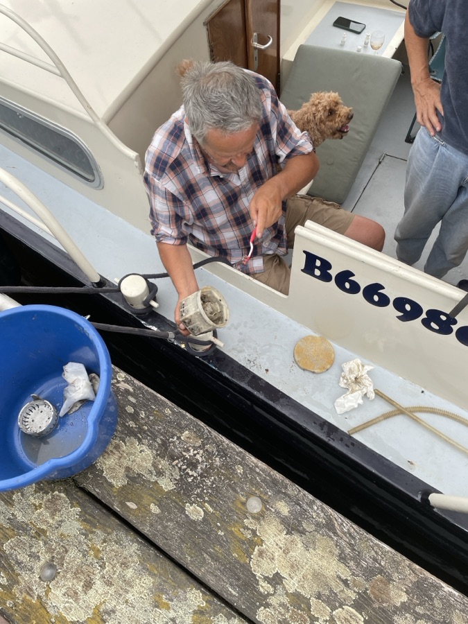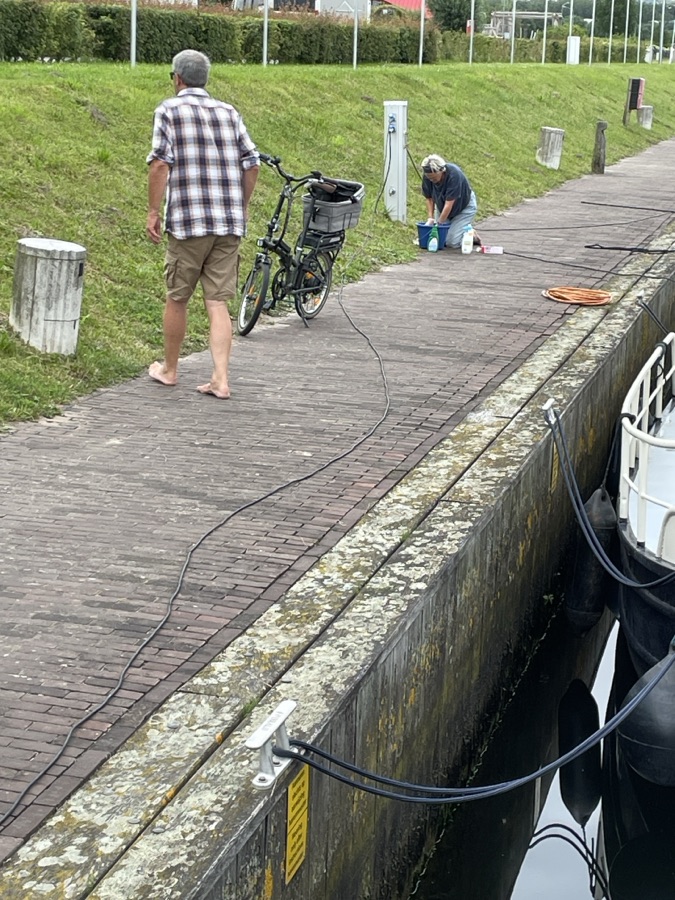 Ze zijn nog volop bezig de moed zinkt in mijn schoenen, om 16 uur gaan we in het water, alles moet nog gebeuren maar een verrassing van jewelste de schipper heeft al de helft van de boot gepoetst (binnen) hij kon mij niet blijer maken!