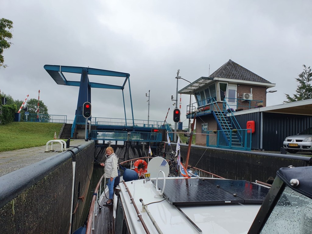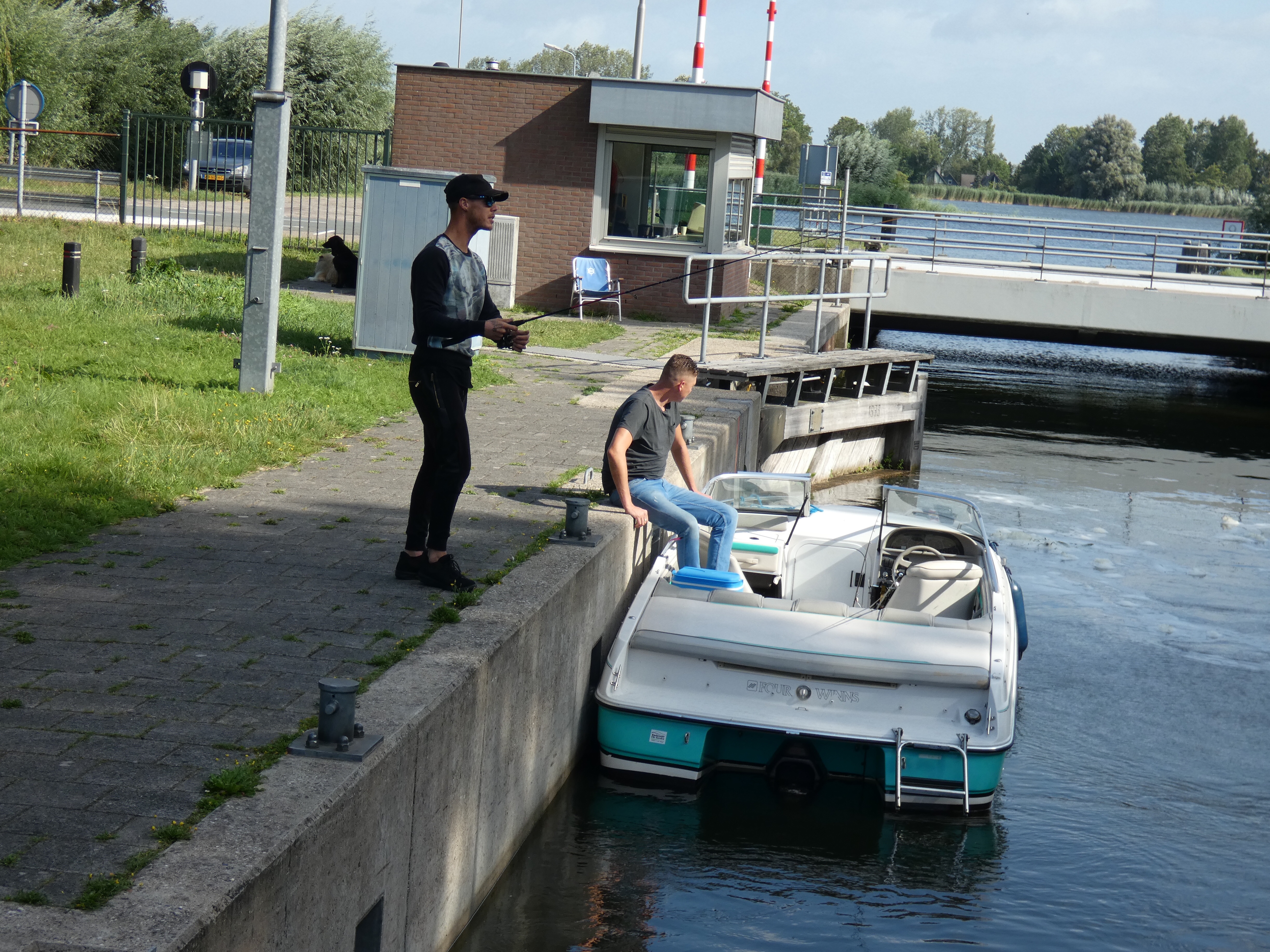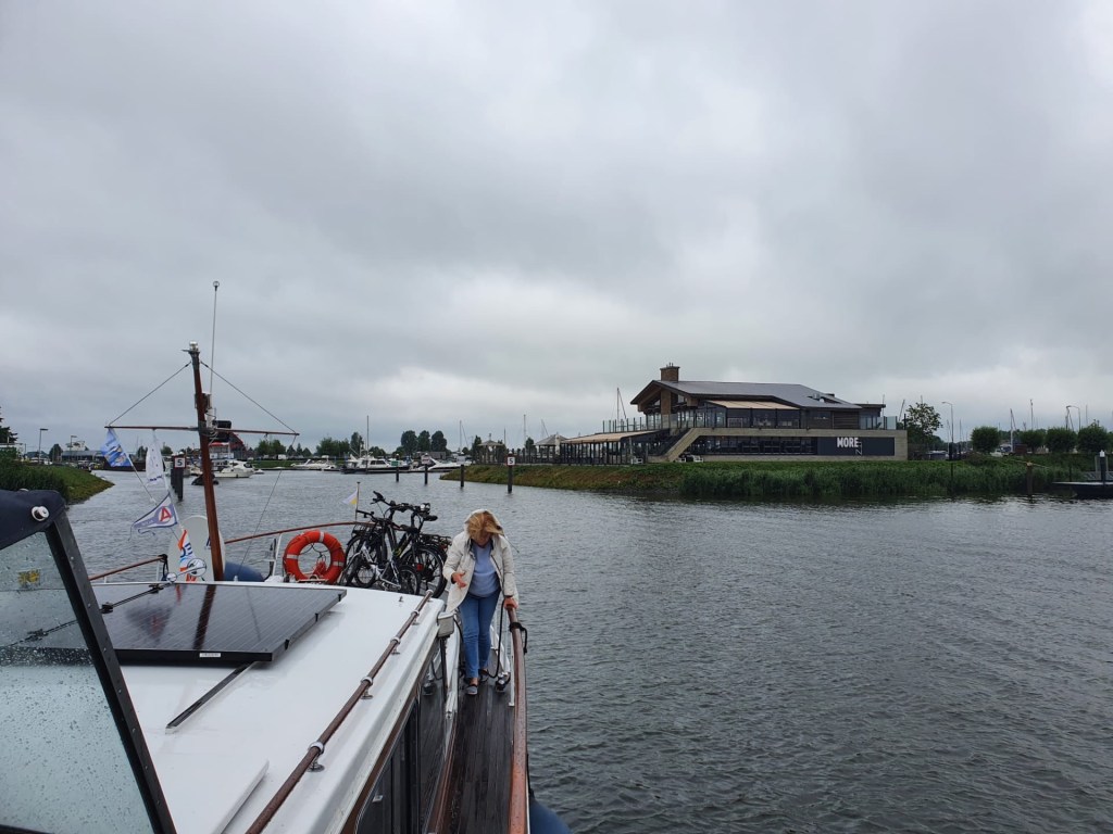 Een vriendelijke jongedame wacht ons op in de haven, de langssteiger mogen we gebruiken! Met aflandse wind aanleggen en natte touwen, allé het kan beter!