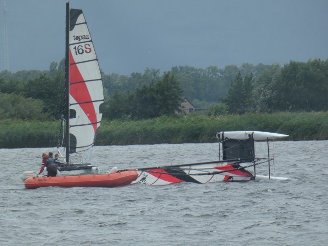 Er wordt gezeild dat het een lieve lust, twee catamarans zijn omgekeerd en nu ploeteren om dat zeil terug recht te krijgen, zou het totaal niet zien zitten.