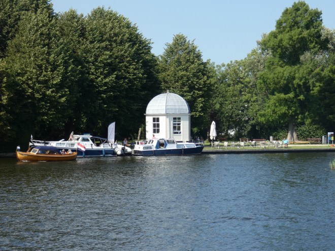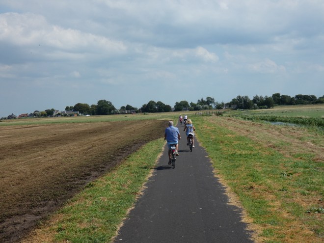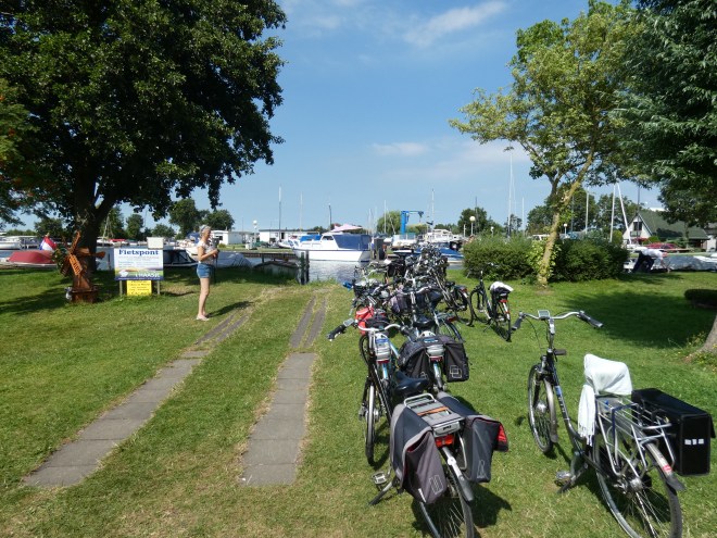 Maar we genieten van de aangename temperatuur, van het platte land, echt plat, van de sloepen die ons passeren, van het wachten op het pontje en van het biertje onderweg.