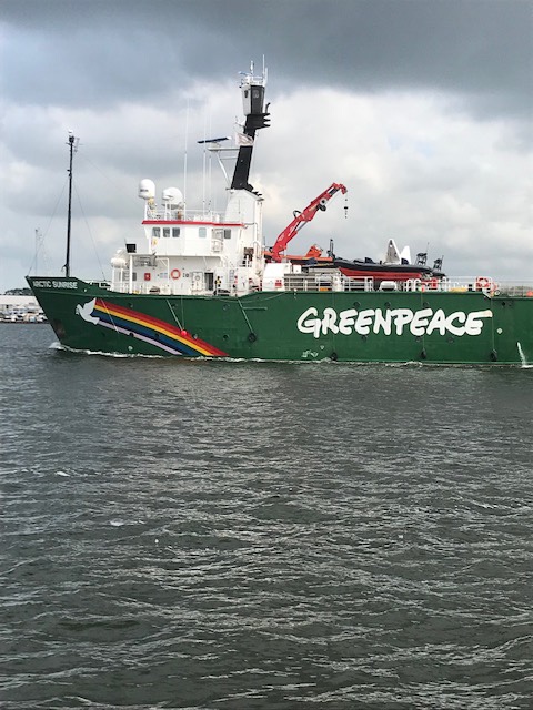 Een boot van Greenpeace kruist ons.