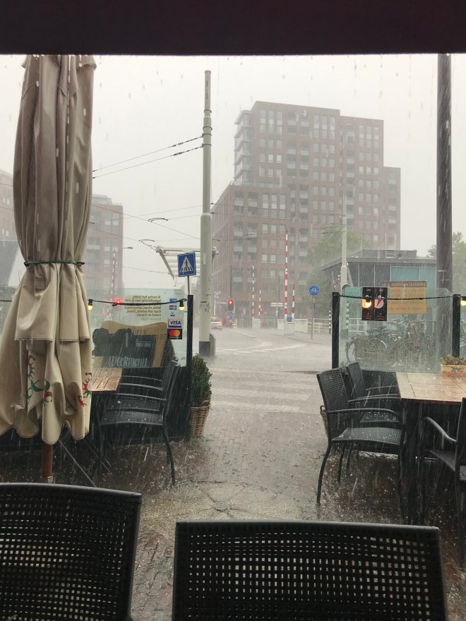 Een plotse felle regenbui verrast de terrasgasten, iedereen vlucht binnen, gedaan met het warme weer.