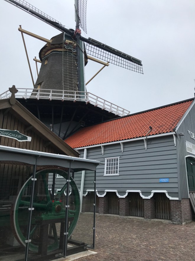 Een wandeling naar de molen Salamander, een schipstimmermolen, heel goed gerestaureerd in de zo specifieke kleuren van hier, oer-Hollands, onze benen even strekken.